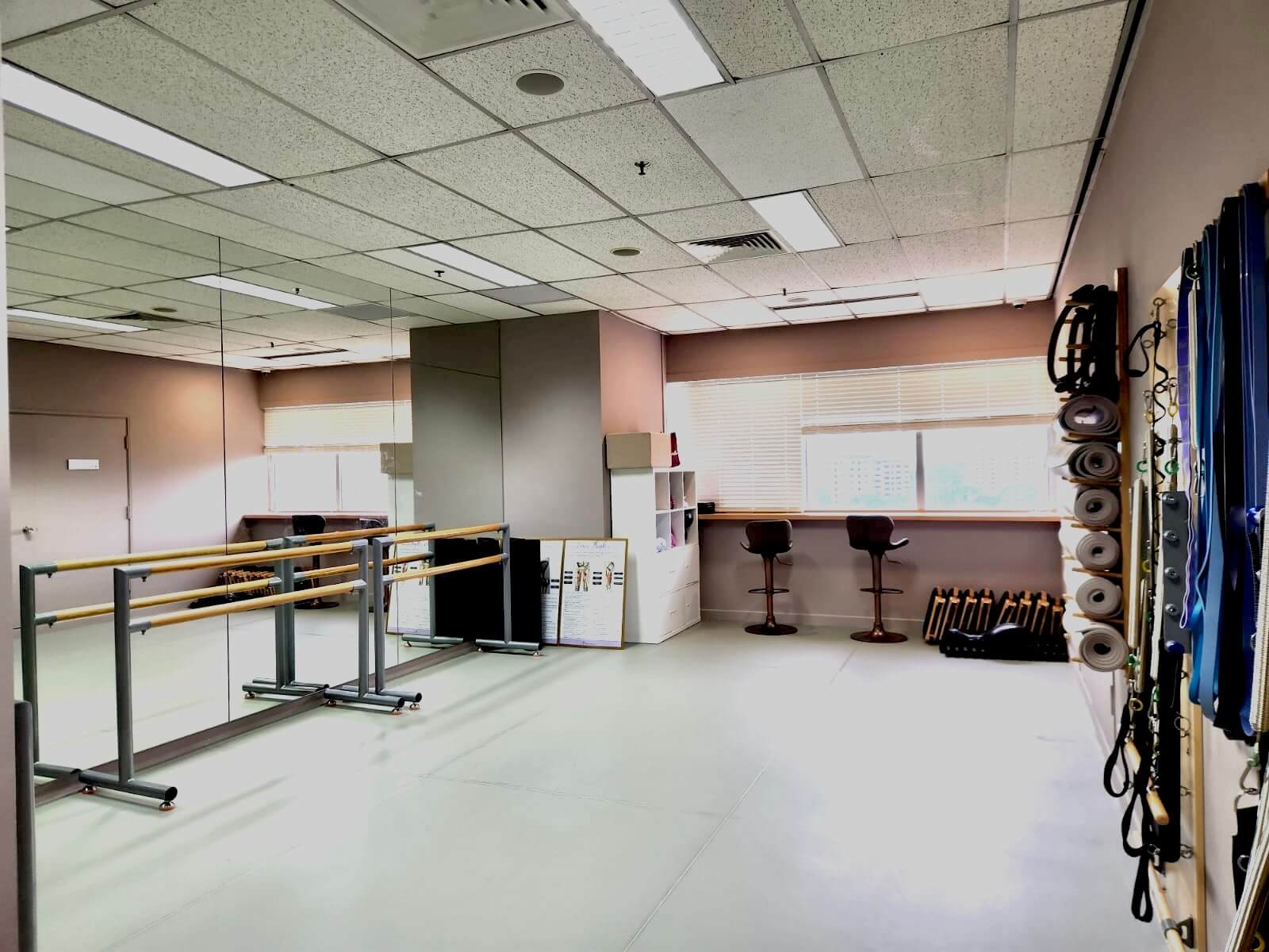Our studios all have natural sunlight filtering in and clear city views. Also, all dance studios are fitted with floors-to-ceiling mirrors and imported dance vinyl and sprung floors from Harlequin®, maker of professional floors for dance, using its top end line STUDIO® series model for better protection from injuries for dancers to ensure their safety while pursuing their passions.